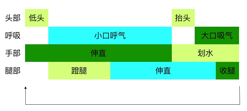 蛙泳 我目前能游出最远距离的泳姿。 视频 蛙泳教学完整版 动作时序图 要领 先划手,后收腿,先伸胳膊后蹬腿。 腿部动作时一定要勾脚,大腿不要收太多。 收腿放松,蹬腿用力,蹬完一定要漂一会,把握好节奏,不要快蹬快收。 手部划水动作不要过大,不要超过肩部。 两手开始外分时就抬头吸气。 自由泳 视频 值得一看的自由泳教学视频